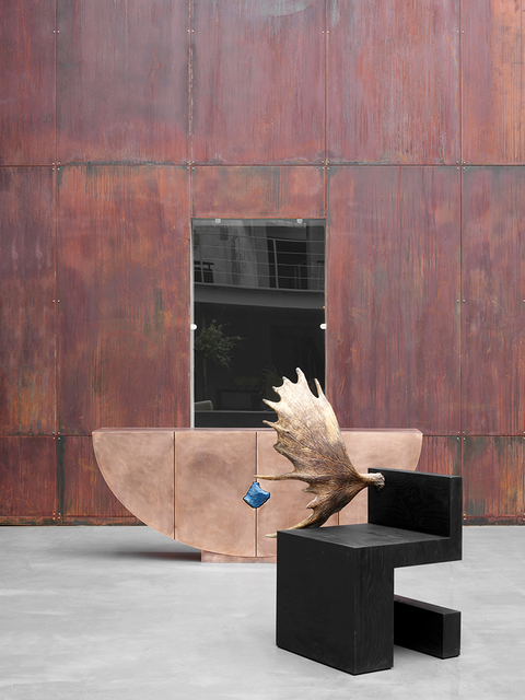 THIS LIVELY, INTENSE RELATIONSHIP WITH GEOLOGICAL ELEMENTS CAN BE SEEN AS A MIRROR IMAGE OF RICK OWENS' RELATIONSHIP WITH THE ELEMENTS OF THE EMPIRE OF THE LIVING. IF STONE IS NOT ABSENT FROM OWENS' WORK, IT IS A FOUNDATION ON WHICH A HORN STANDS, A MARVELOUS AND THREATENING SCULPTURE THAT NEVERTHELESS INVITES TACTILE EXPERIENCE. BURNT OR STRIPPED WOOD ARE MUTE TESTIMONIES TO THE ARTIST'S ATTRACTION TO THE INFINITE POSSIBILITIES THAT NATURE MAKES AVAILABLE TO THE CREATOR, AND THEIR PRESENCE EVEN QUESTIONS THIS AVAILABILITY: ACT OF THEFT OR MAGNIFIED USE? THERE'S A VIOLENCE IN THIS BURNT WOOD THAT SIGNALS AN ACT OF POSSESSION OVER NATURE, AND WHEN NICLAS WOLFF TRANSFIGURES THE RAGING ELEMENTS BY COPYING THEIR APPEARANCE, RICK OWENS IS PERHAPS MAKING NATURE THE RECIPIENT OF MAN'S UNBRIDLED FEELINGS.